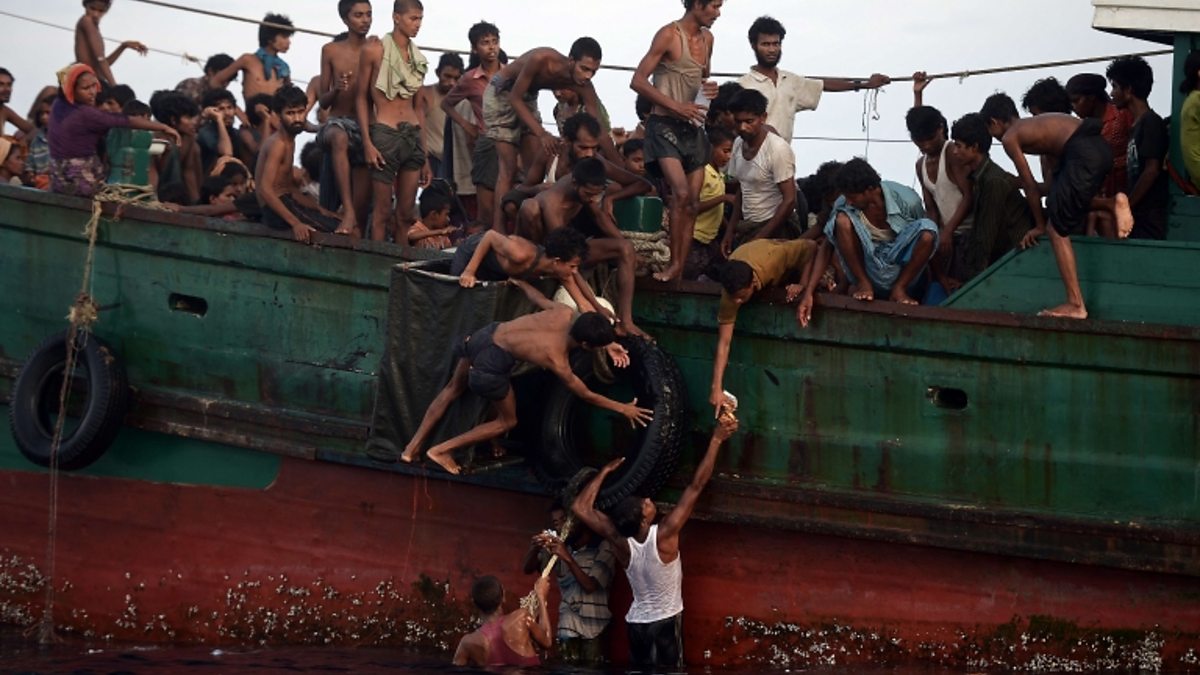 (Picture: Rohingya migrants pass food supplies dropped by a Thai army helicopter to others aboard a boat drifting in Thai waters off the southern island of Koh Lipe in the Andaman sea. Credit: AFP/Christophe Archambault.)