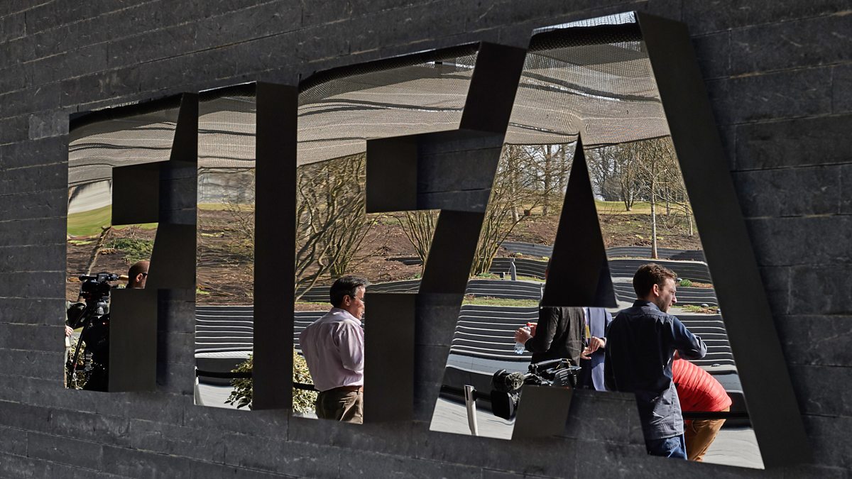 (Image:Member of the media wait next to a logo of the Worlds football governing body. Credit:MICHAEL BUHOLZER/AFP/Getty Images)