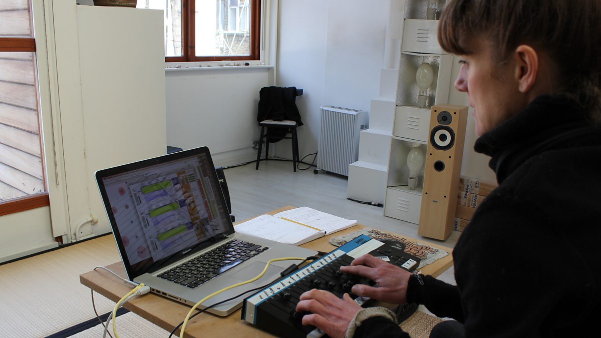 Sara Mohr-Pietsch visits the East London studio of sound artist and electronic composer Kaffe Matthews. Kaffe shows Sara the bikes she uses for her bicycle operas, demonstrates the cube of speakers where she plays with sharks, and talks about the creative process in her constantly changing workspace.