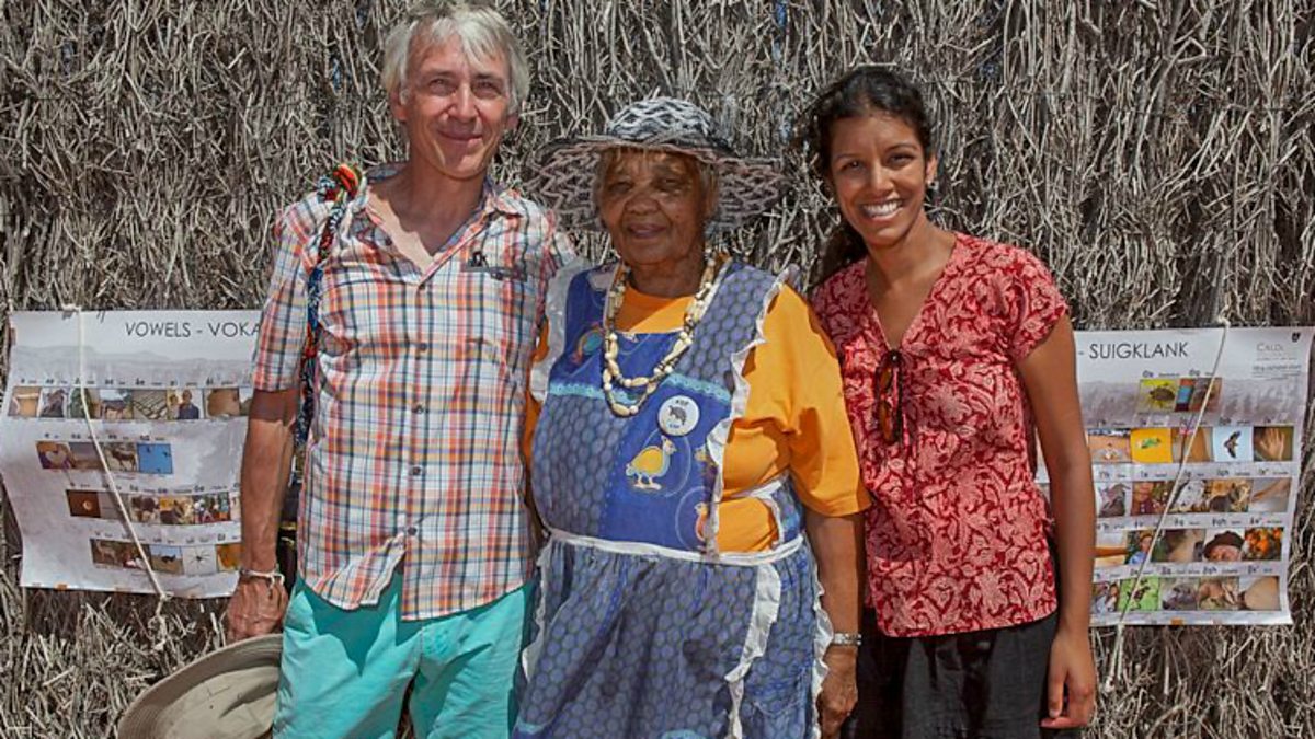 (Picture: Linguists stand either side of one of the only three people to speak N|uu. Credit: Paul Weinberg)