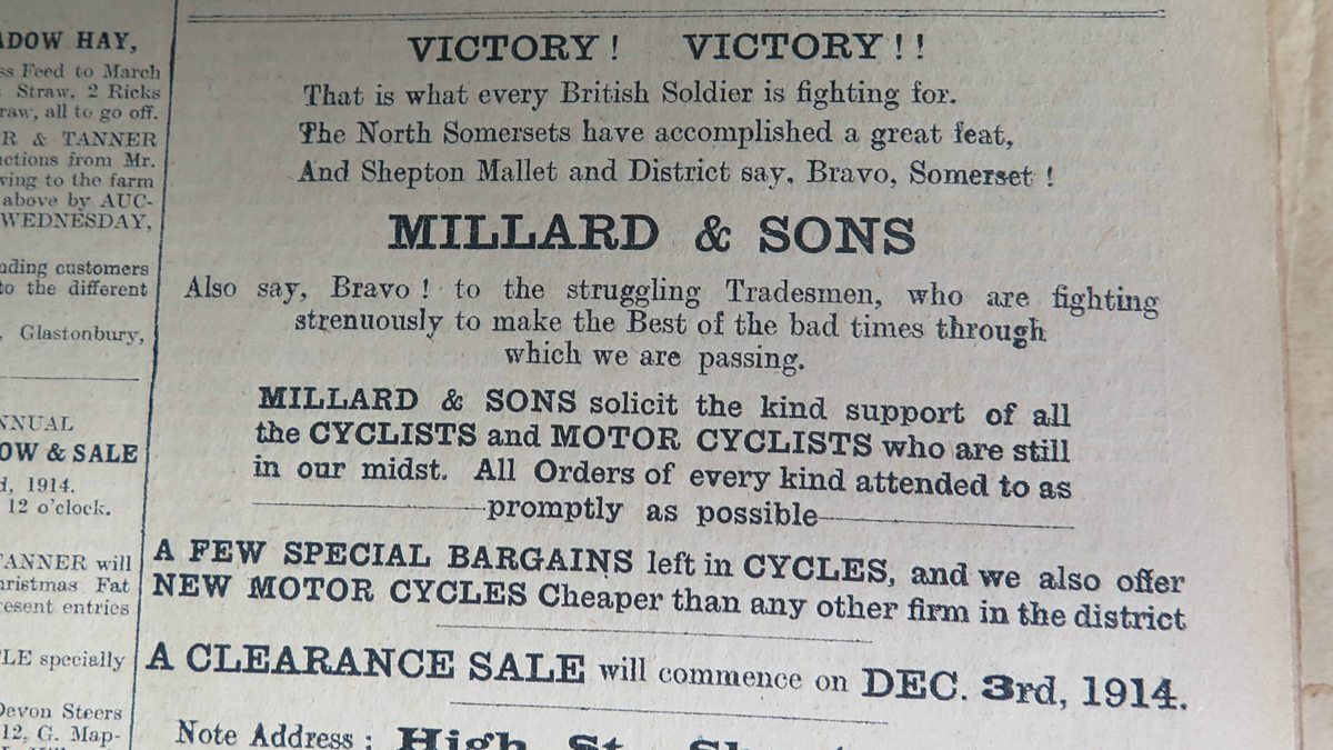 Image: Millard & Sons advert 27 November 1914, courtesy of Shepton Mallet Journal