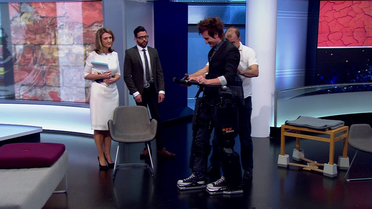 Simon Kindleysides has taken his first steps since becoming paralysed from the waist down with the help of the world's first hands-free, independently controlled, robotic walking device. Speaking on the Victoria Derbyshire programme, he described his feelings on taking those first steps and demonstrated the machine once again - an emotional moment for his brother Sean Lake. Jon Graham, from the centre which helped Simon walk, explained just how much computing code went into the high-tech machine.