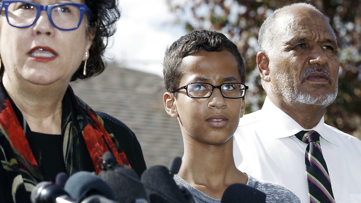 (Picture: Ahmed Mohamed with his lawyer and his father. Credit: AP)