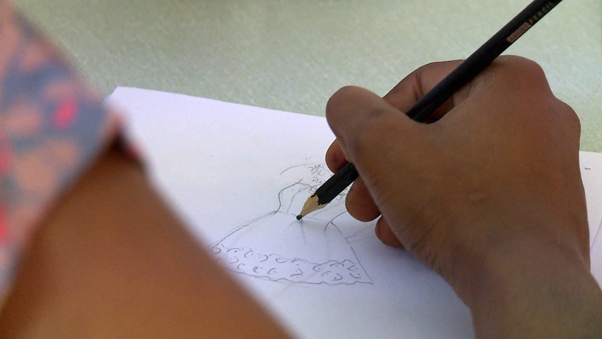 Dress Designer and maker Chinelo Bally gets to work by sketching out the design for the dress then free cutting the leather from the salvaged sofa