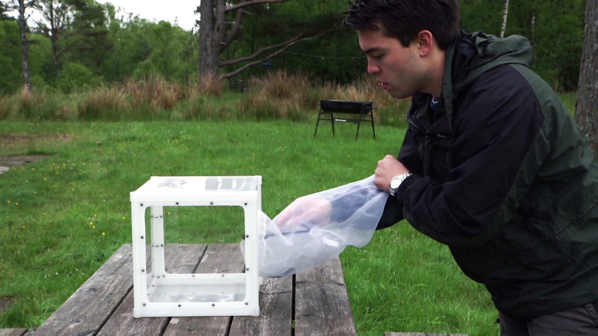 A hungry midge saws through Presenter James Logan's skin and feeds on his arm