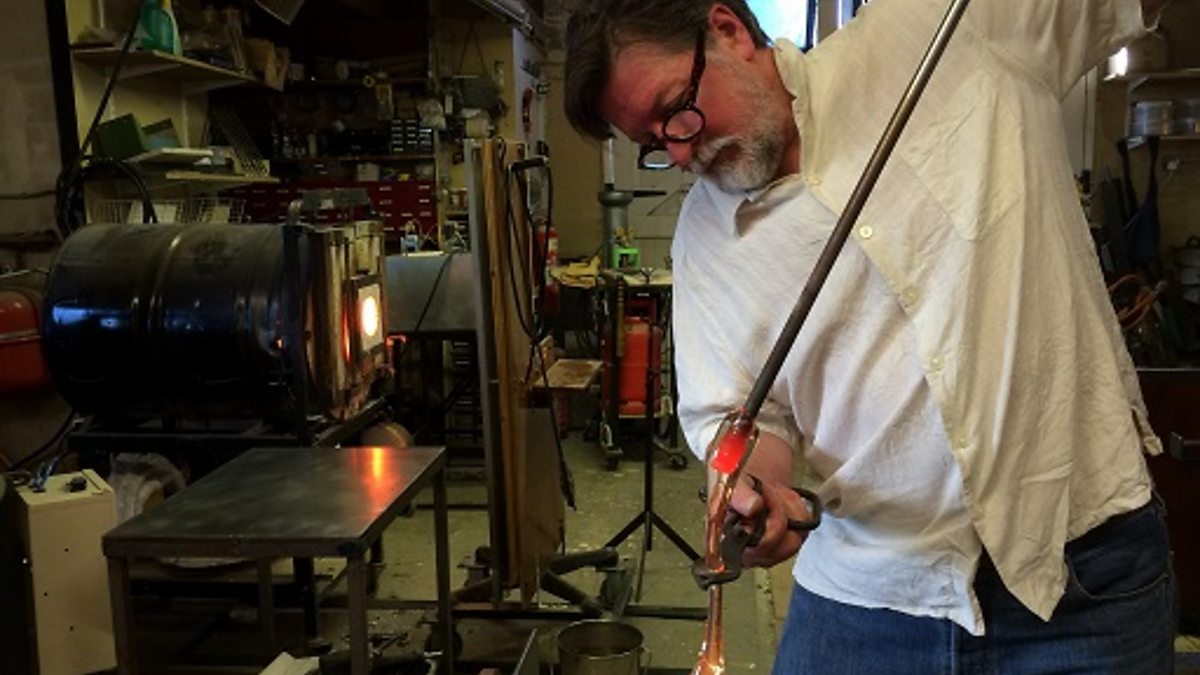 Glassblower Scott Benefield makes handblown glass objects in his studio in Randalstown.