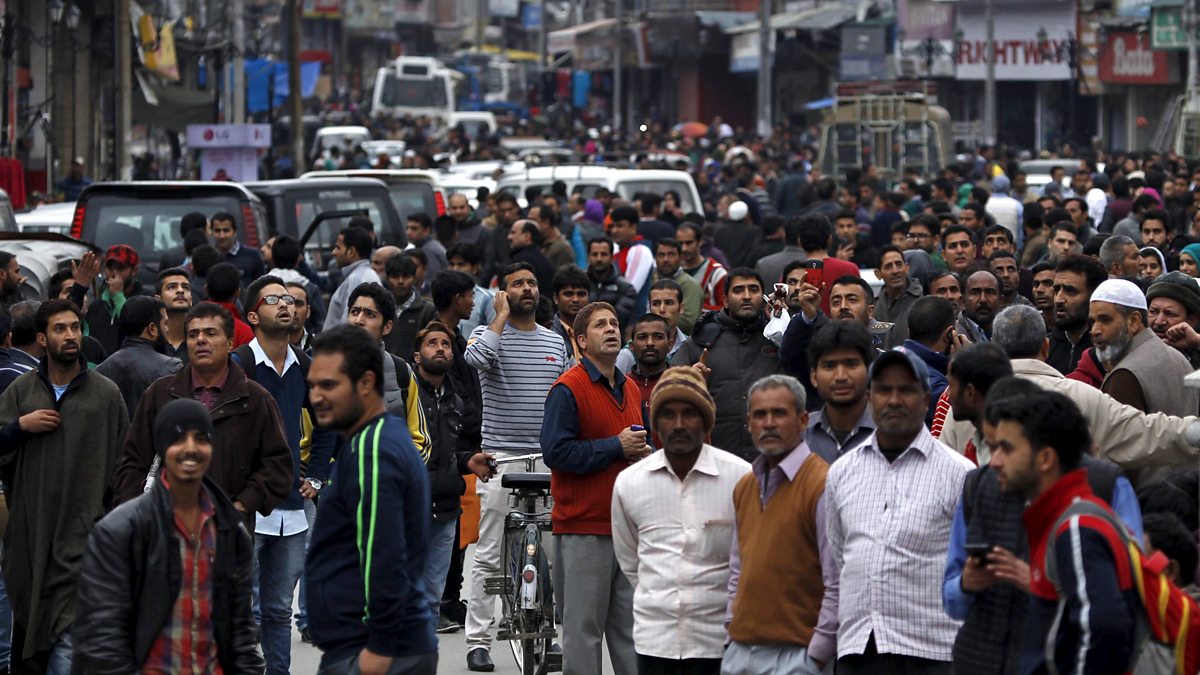 Image: People stand on a road in Srinagar after vacating buildings following the earthquake.Credit: Reuters/Danish Ismail