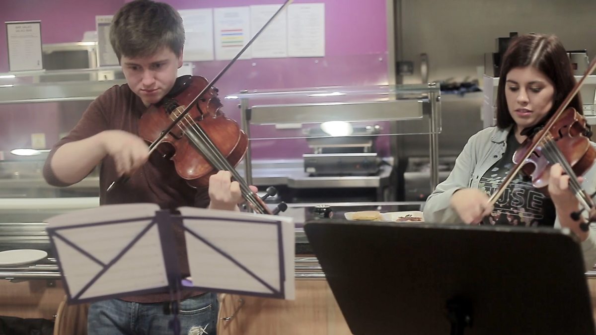 Casi yn cyflwyno'r pedwarawd llinynnol, a ymunodd â'r criw am 2 y bore.