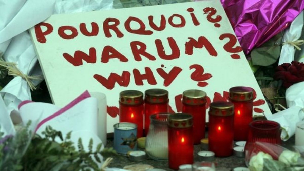 (Photo: A sign reads 'Why?' surrounded by candles. Credit: Getty Images)