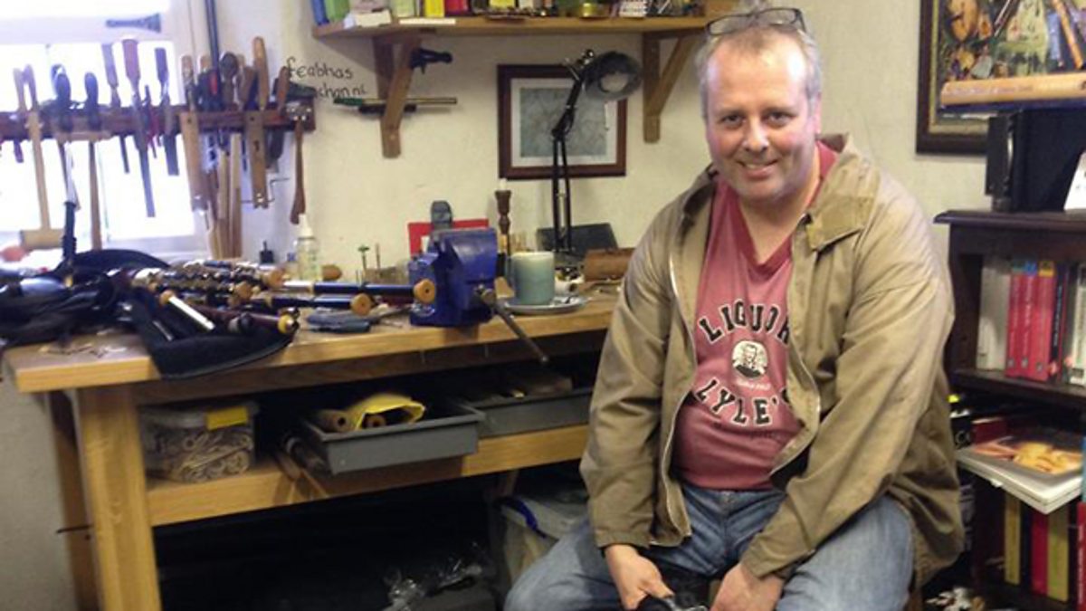 Martin Preshaw, déantóir píoba uilleann, ag insint do Threasa Bhreathnach cad é atá i gceist le píoba uilleann a dhéanamh.