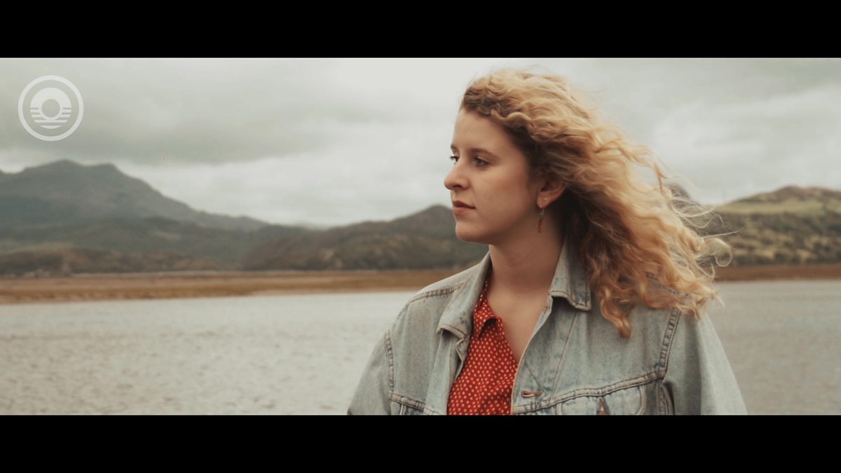Dyma Hannah yn chwarae sesiwn ger y dŵr yn edrych dros pentref hyfryd Portmeirion.