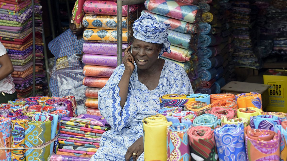 Image: A shop owner makes a call at the Oshodi market - the heart of Nigerian style. Credit: Getty
