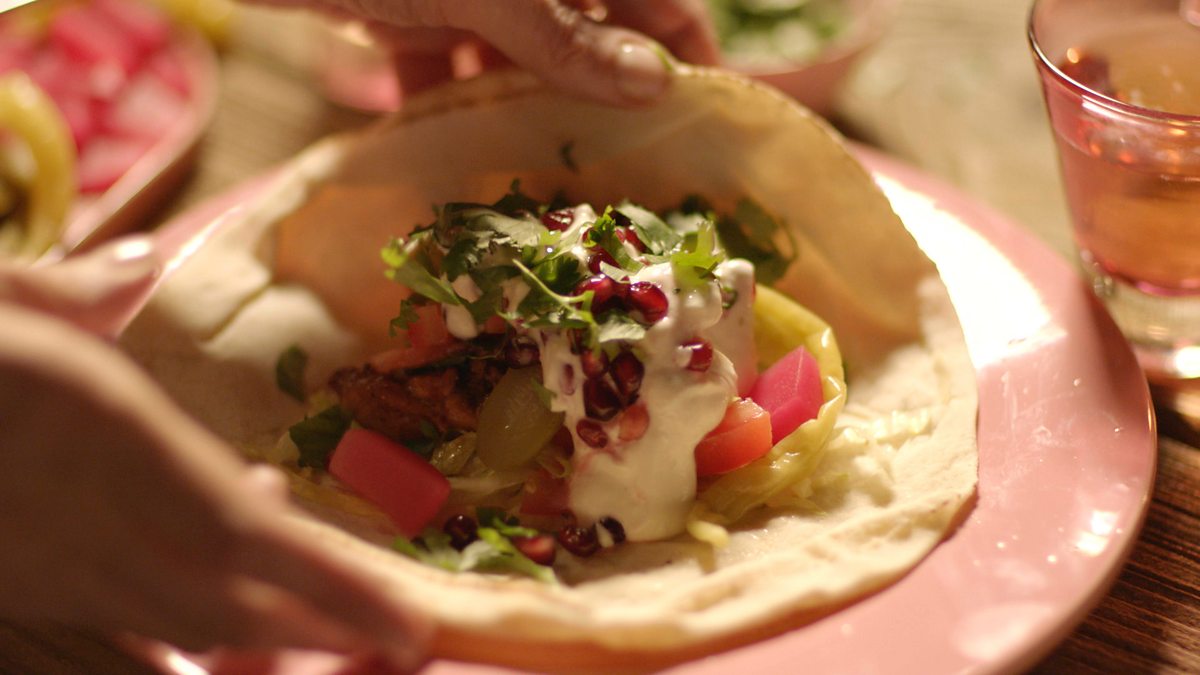 Chicken shawarma is usually cooked on a spit, but this is roasted in the oven. Here, I¹ve served it modestly, on a pile of shredded iceberg, with some warmed pitta, lemon wedges and a tahini sauce, as made below. When I make this for groups of friends, or for a family lunch or supper, I slice up some fresh tomatoes sprinkled with mint, and cut some cucumbers into wedged slices, and macerate some red onions, cut into half-moons, with red wine vinegar or lime in which case it will serve up to 10 people.
