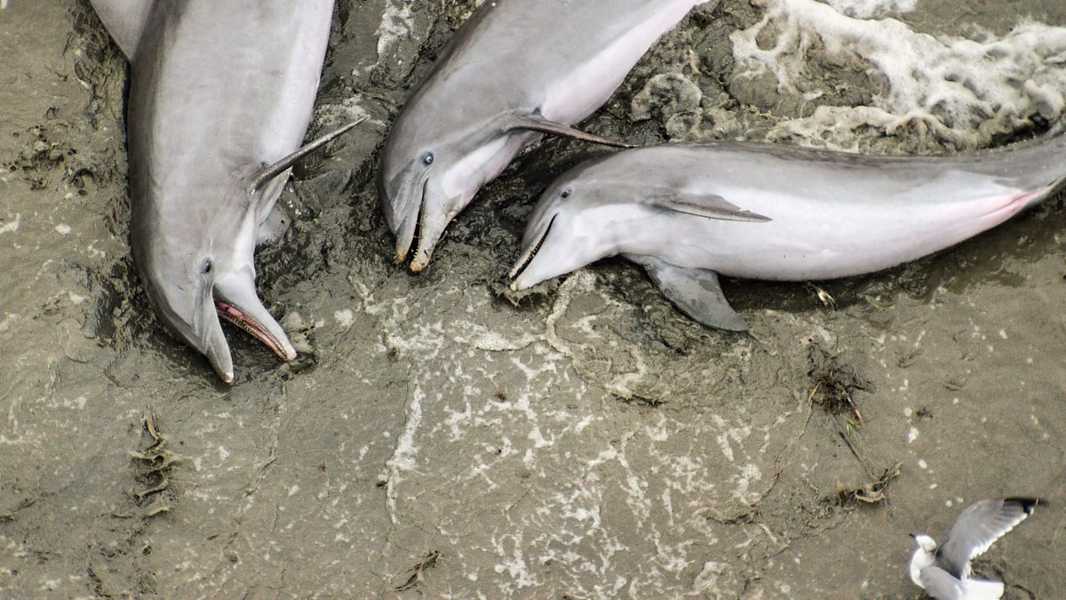 Working in perfect unison the dolphins charge to the shore, creating a bow wave that carries their prey onto the muddy banks where the dolphins pick them off.