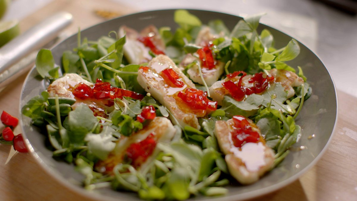 When I described halloumi once as 'salt-flavoured Polystyrene', people thought I was being derogatory. Nothing could have been further from the truth. There is something so compelling about this squeaky cheese, and my fridge is stocked with it at all times. Most regularly I treat it as vegetarian bacon, dry-fried in a hot pan then dolloped with a peeled, soft-boiled egg (I'd rather peel an egg, even when it's hurty-hot, than poach one). But the idea for this recipe came to me one evening when I felt the need to counter the siren call of the halloumi's saltiness with some sweet-and-heat.