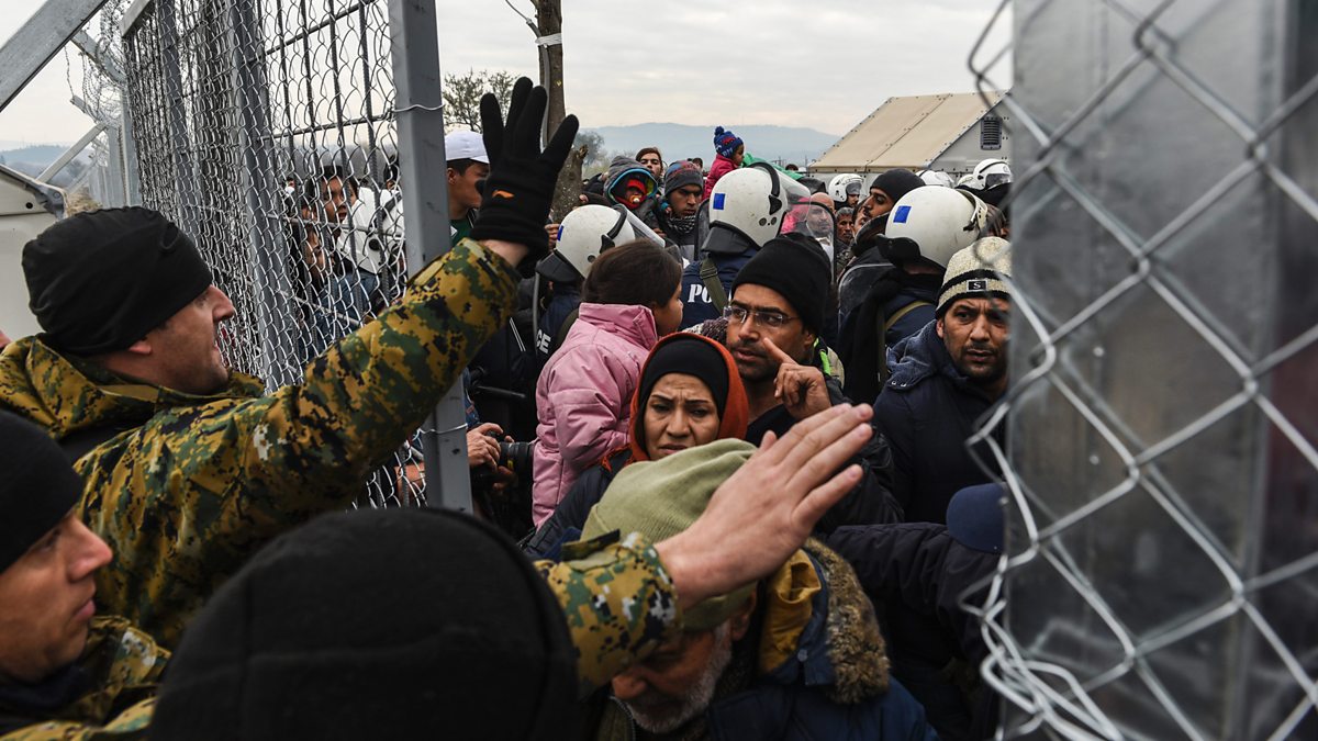 (Image: Migrants and refugees cross the Greek-Macedonian border. Credit: Getty Images)