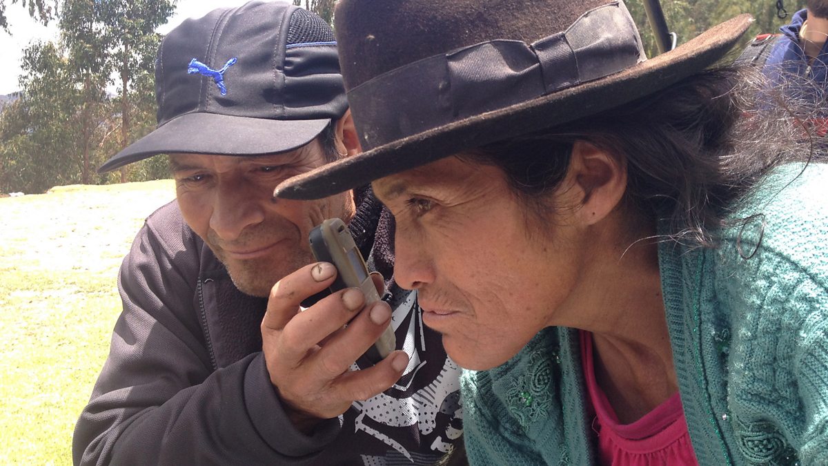 (Image caption: In Ayacucho Peru, listening to the testimonies shared on the phone line of the Quipu Project © Maria Court)