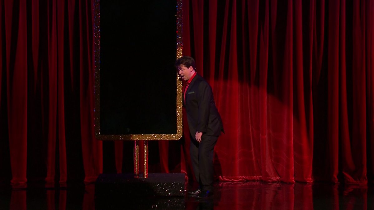 Michael borrows a mobile phone from an audience member...to share with the audience.