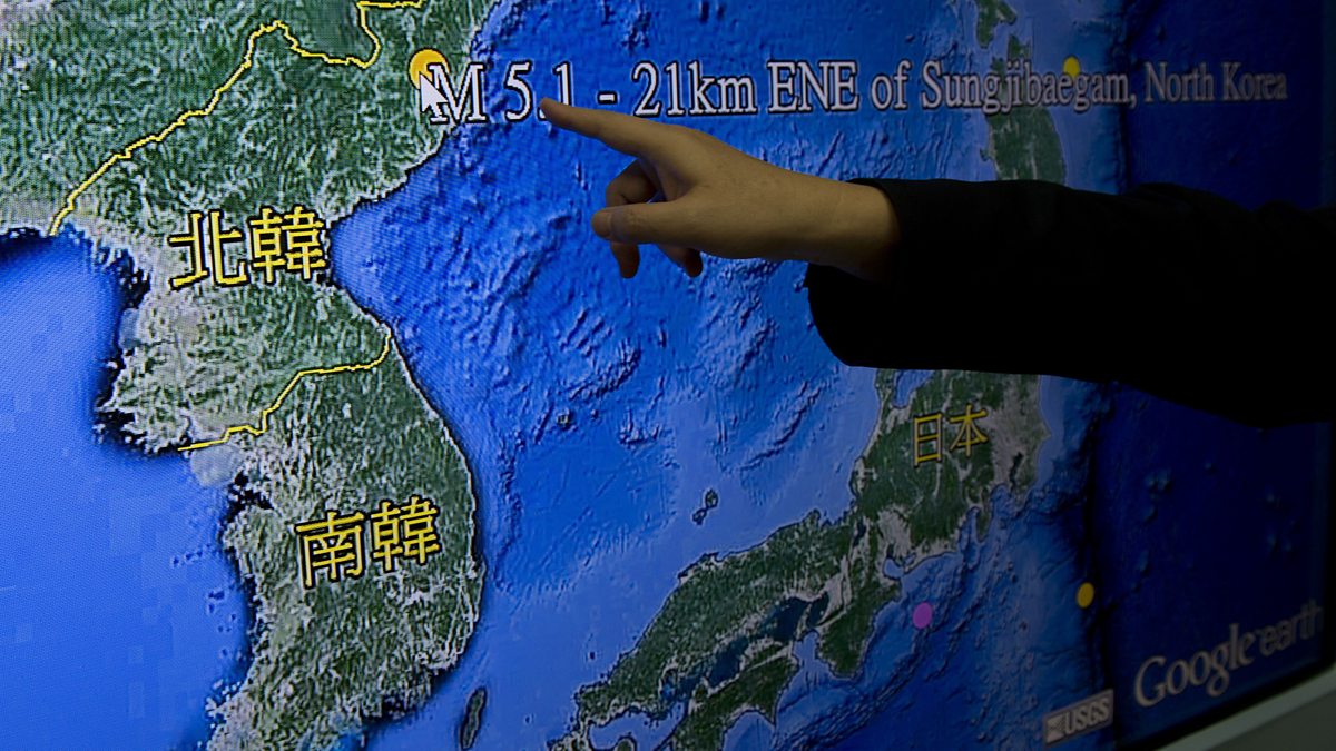 (Photo caption: Kuo Kai-wen, director of Taiwan's Seismology Center, points at the locations from a monitor showing North Korea's first hydrogen bomb test site © SAM YEH/AFP/Getty Images)