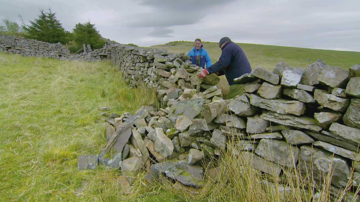 Stuart Fry, a stone waller, is repairing a 300 year old wall in the uplands near Llandeilo. He explains how a wall should be built.