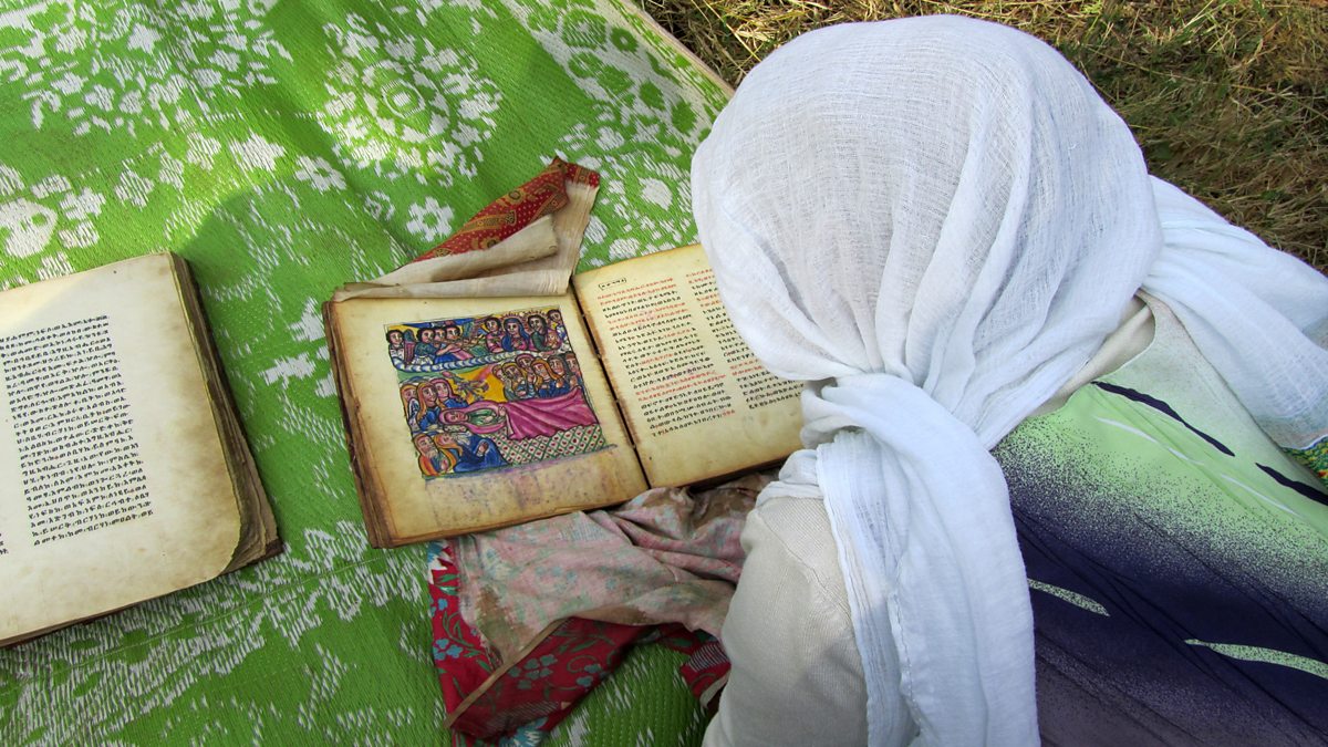 (Photo: Scholar reading Walatta Petros manuscript at monastery. Credit: Wendy L.Belcher)