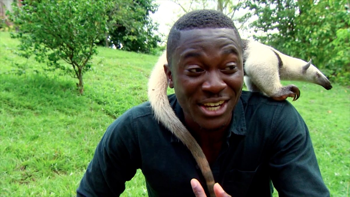 Robin the Tamandua is keen to find out if Patrick is hiding any ants about his person.