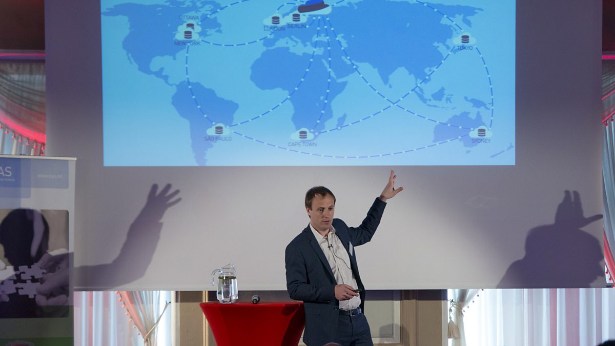 Image: Taavi Kotka, Estonia's chief information officer presents the e-residency IDs project in 2014 in Tallinn. Credit: Raigo Pajula/AFP/Getty Images)
