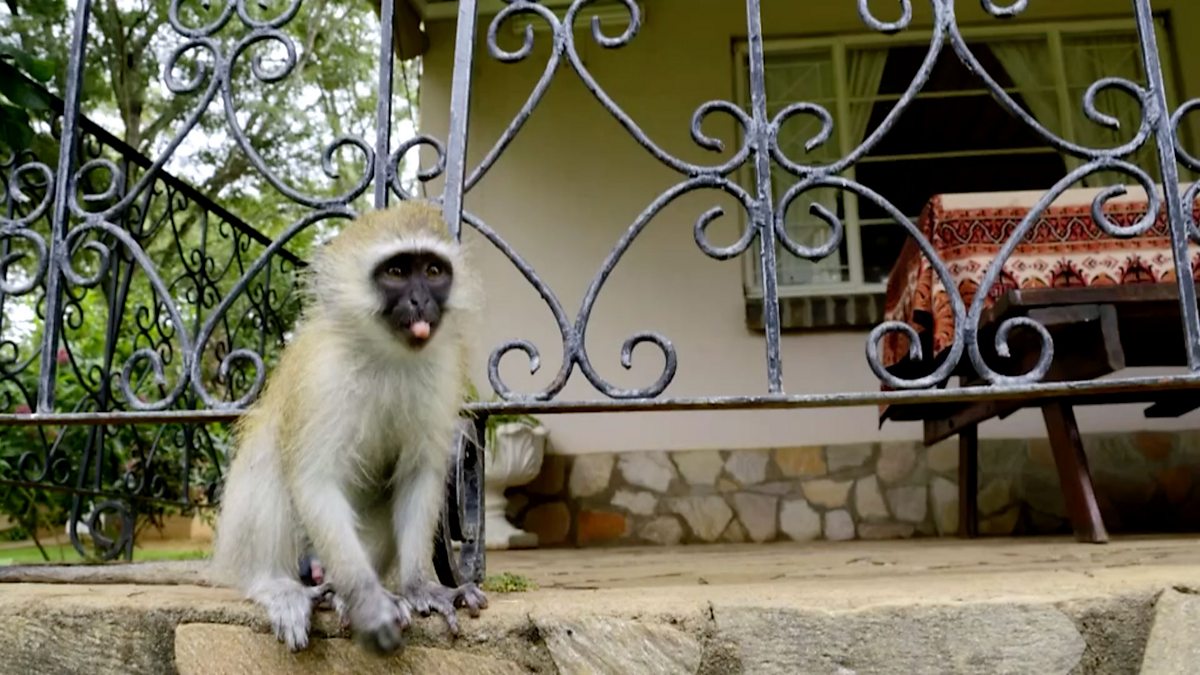 Sarah introduces vervet monkey Horace to a new orphan, a rescued monkey called Jackie.