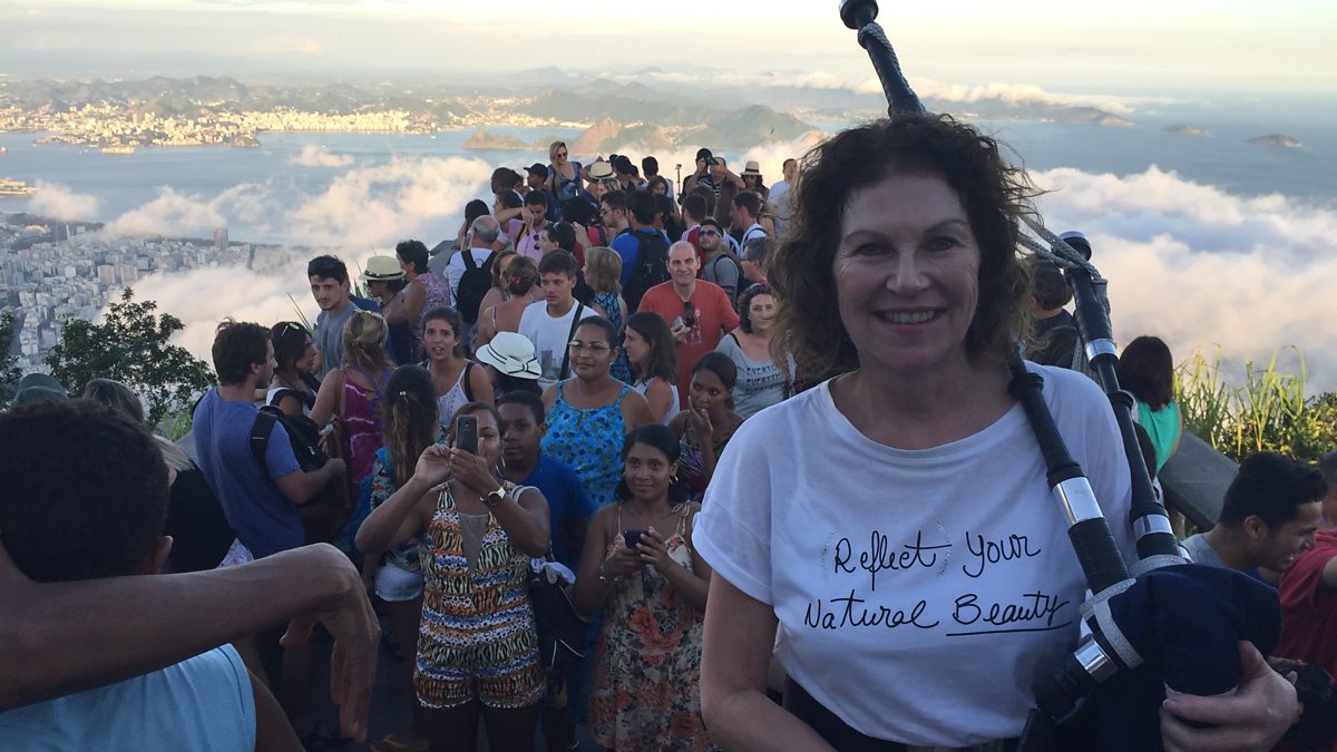 A woman from Poole is playing her bagpipes across the world to raise money for good causes