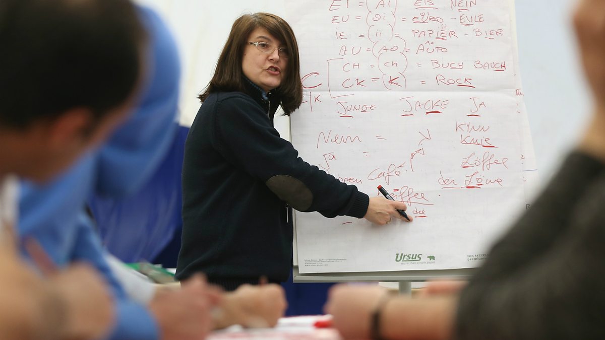 Image: Samira, a volunteer teacher, leads a German-language class for refugees from Syria in Berlin. Credit: Sean Gallup/Getty Images