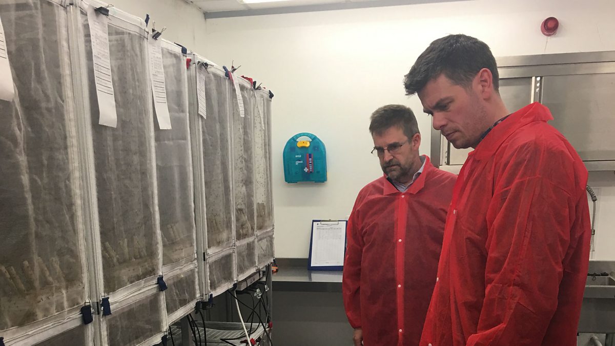 Image: Adam Hart with Hayden Parry in the Oxitec mosquito breeding lab, BBC Copyright