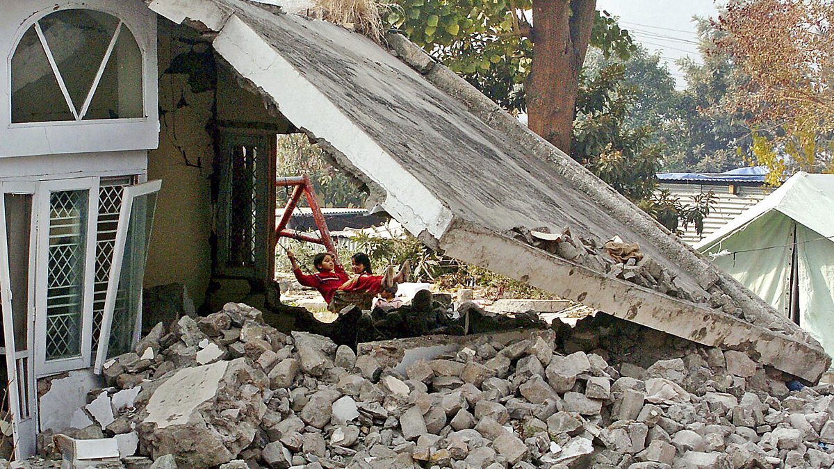 (Photo: Pakistani Kashmiri girls play outside a collapsed house in the devastated city of Muzaffarabad, the capital of Pakistan controlled Kashmir, 2005. Credit to Getty Images)