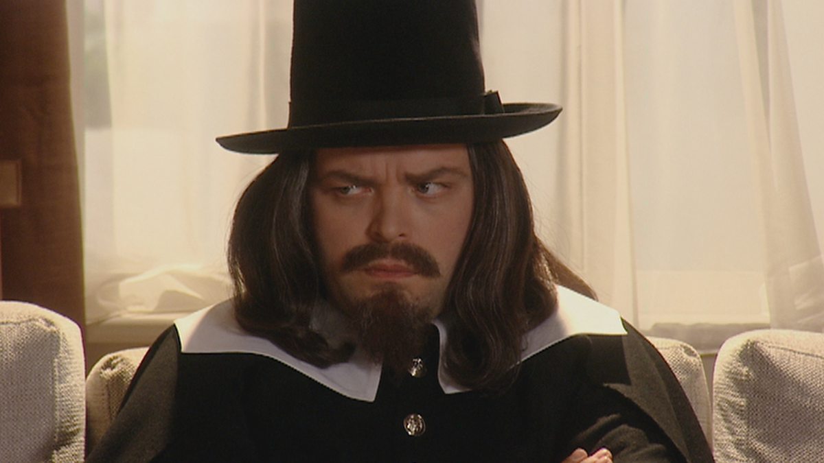 This sketch juxtaposes the character of a historical witch-finder with the modern setting of a corner shop. When the gang of peasants arrive as well, it tips over into absurdity.