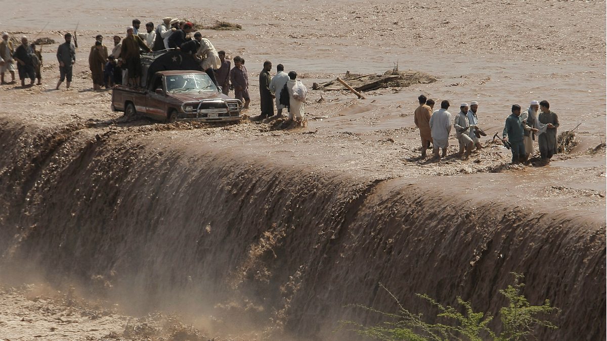 (Photo: Pakistani villagers wade across a flooded road after heavy rain on the outskirts of Peshawar, Pakistan. Credit: AP)