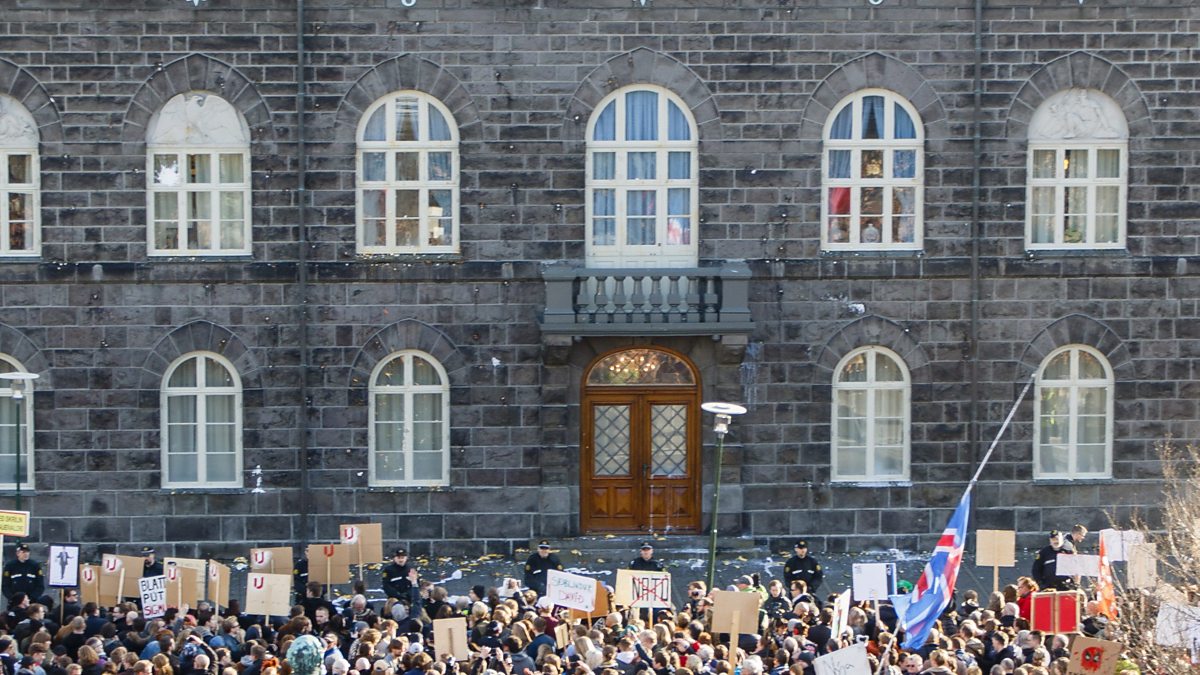 (Photo:Protesters in front of Reykjavik parliament call for the prime minister's resignation. Credit: EPA)