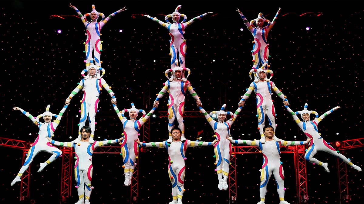 (Photo: Acrobats form a human pyramid as they rehearse with Le Grand Cirque at the Sydney Opera House, 2009. Credit: Getty Images)