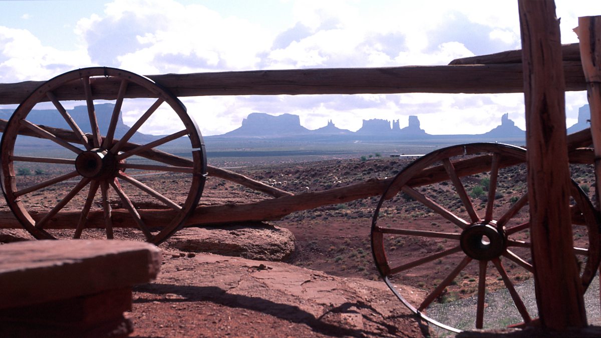 (Photo: Wagon wheels and the view of Monument Valley in Utah, USA)