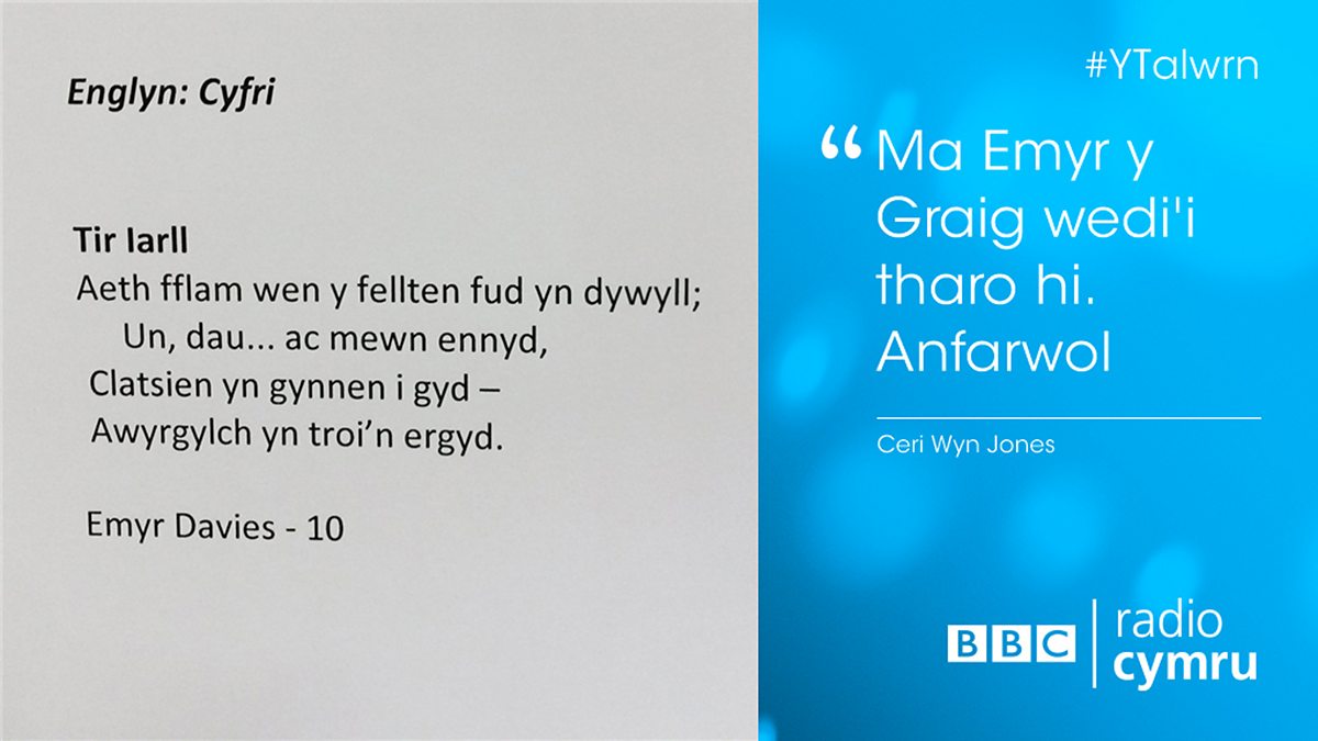 Englyn Emyr Davies o dîm Tir Iarll ar y testun 'Cyfri'. 10 marc.