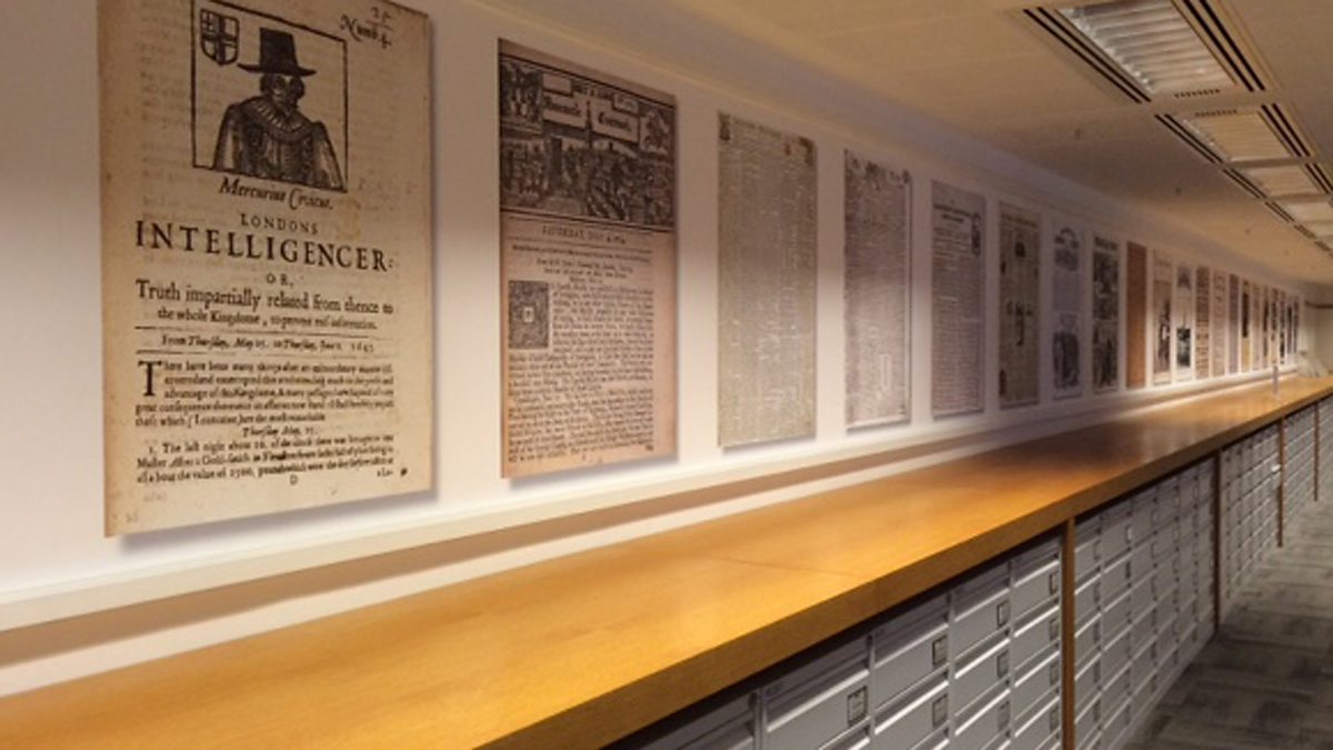 (Image: Early editions of various newspapers hanging on the wall. Credit: Image courtesy of the British Library)