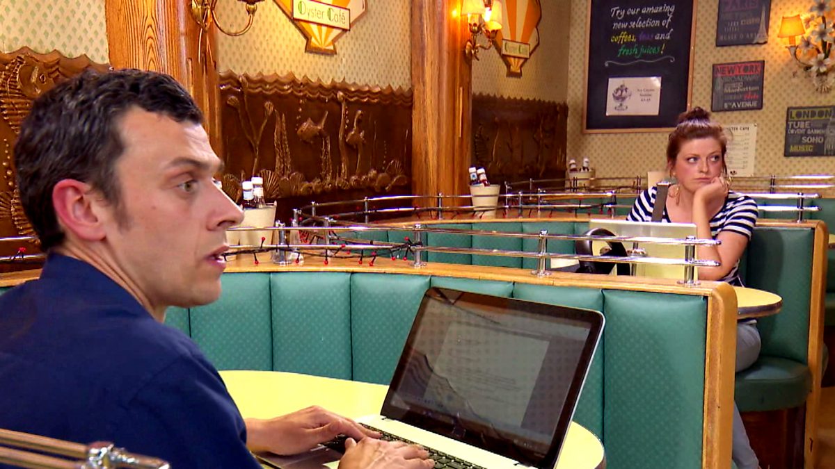 A man asks a woman to mind his laptop in a café. She asks him to return the favour, well, almost…