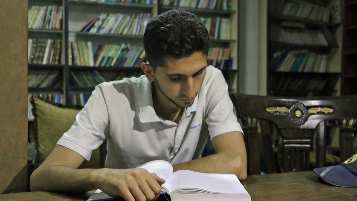 (Image: Abdulbaset reads in the sanctuary of the library)