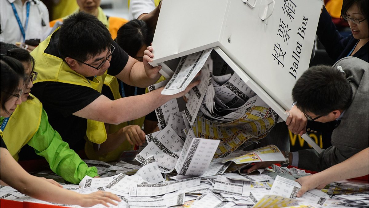 (Photo: Electoral officials empty a ballot box for counting in the Hong Kong Legislative Council elections; Credit: Anthony Wallace/AFP/Getty Images)