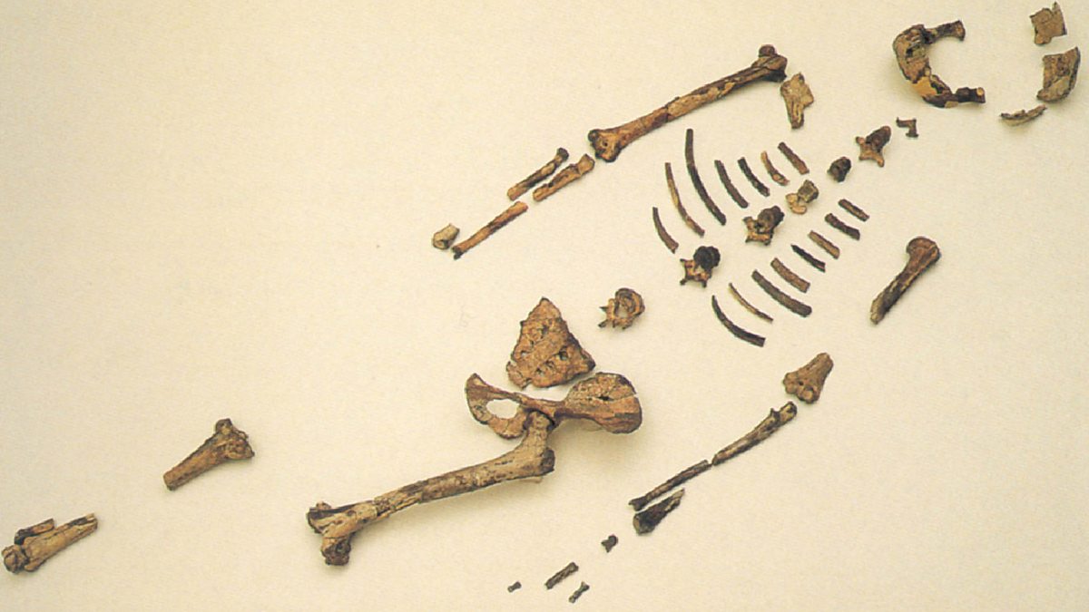 (Photo: The fossil remains of Australopithecus afarensi, known as 'Lucy'. Credit: AP Photo/Houston Museum of Natural Science, Dirk Van Tuerenhout)