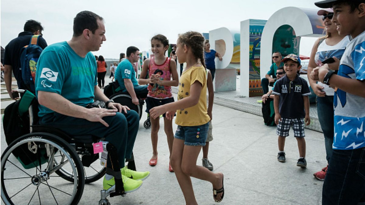(PICTURE: Brazilian Paralympic archer Sandro Colaco (L) talks with children. Credit: Getty Images)