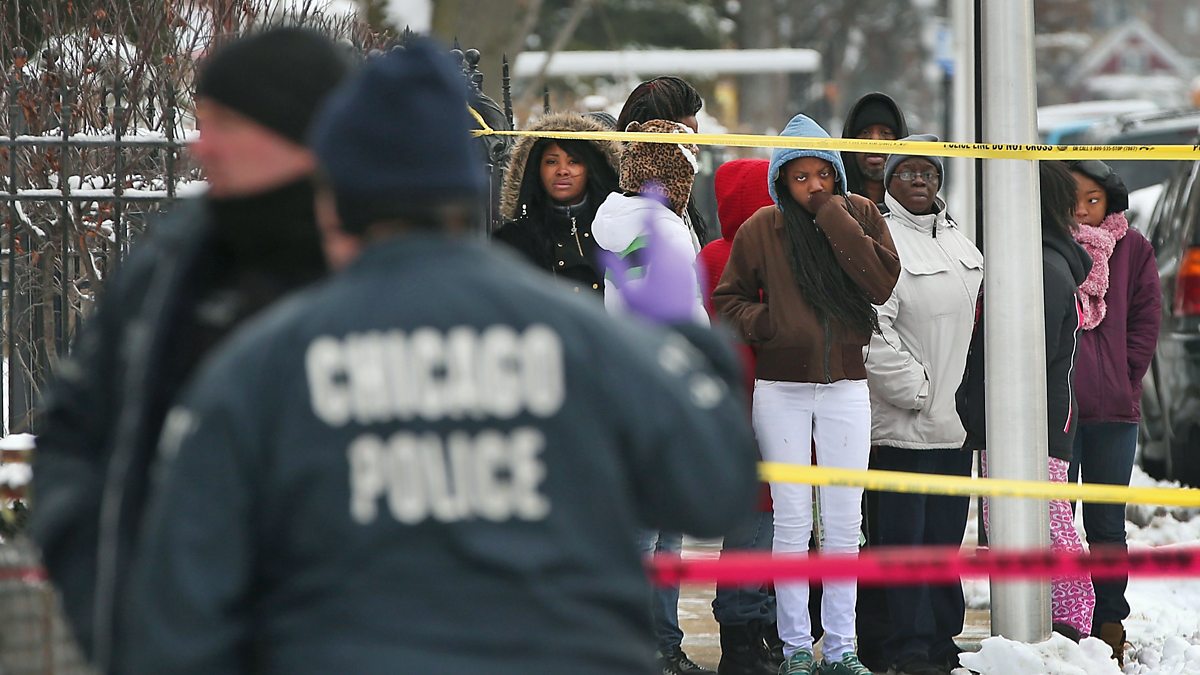 (Image: Chicago - Neighbourhood residents watch as police investigate a homicide scene. Credit: Scott Olson/Getty Images)