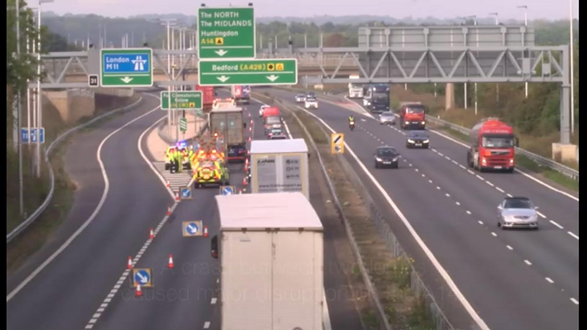 Two lorries crashed at junction 31 on the westbound carriageway of the A14 near Cambridge, where the road meets the M11.