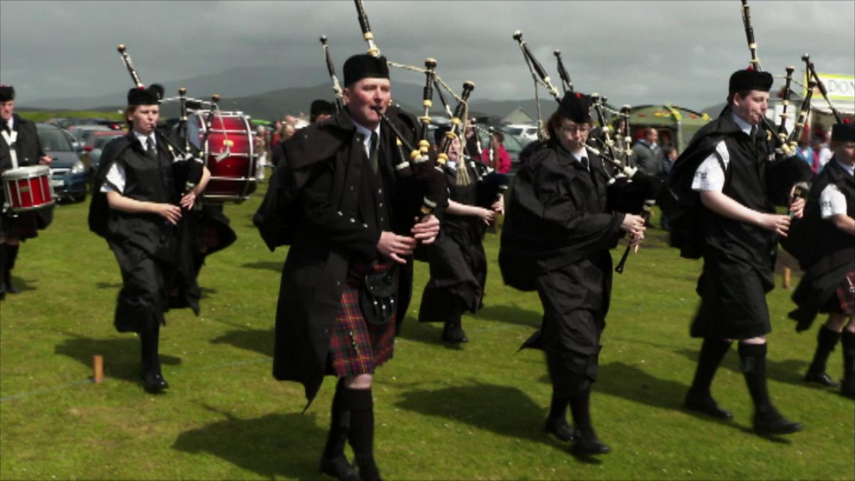 Tha Còmhlan Pìoba Uibhist a’ cluich aig geamaichean Uibhist a Deas