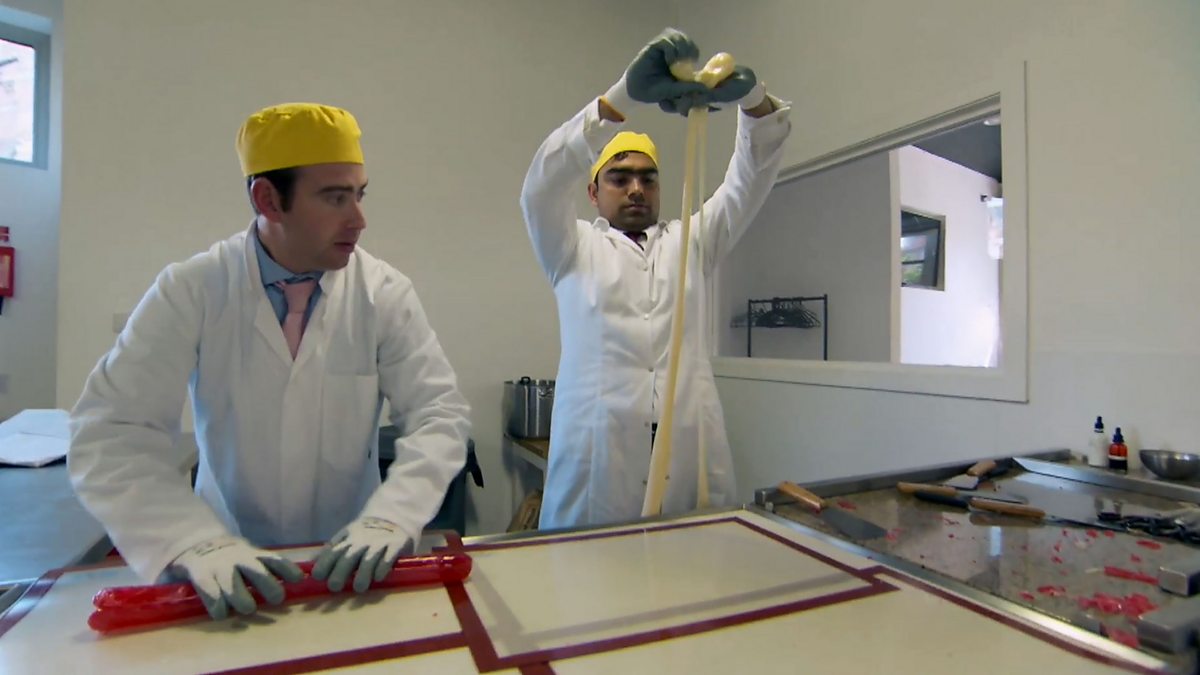 Sausage supremo Oliver struggles with the art of making the perfect stick of rock.