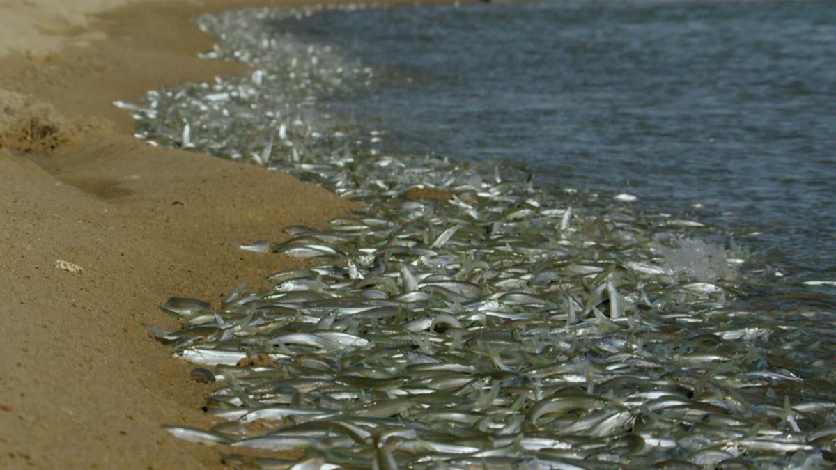 Triggered by high tides in the Sea of Cortez, huge numbers of fish called grunion gather on beaches to spawn. The mass gathering attract predators such as gulls and pelicans.