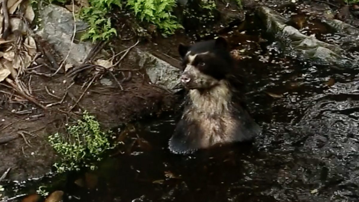A cheeky spectacled bear dismantles a camera trap!